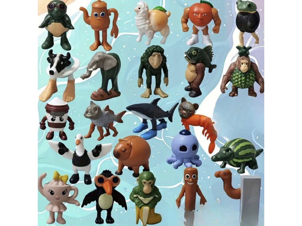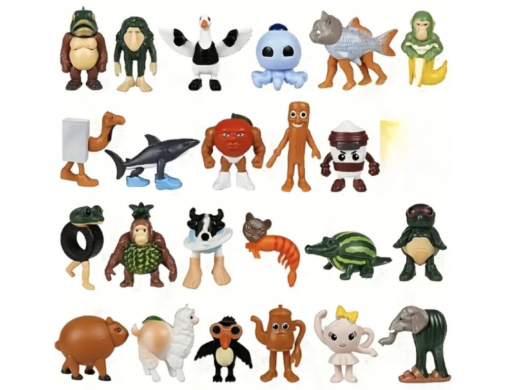 Uvnitř kalendáře objevíte roztomilá i bláznivá zvířátka a postavičky – od žraloků s nohama až po legrační ptáčky, šneky, želvy či zvláštní humanoidní figurky. Každý kousek je propracovaný do detailu a skvěle rozšíří vaši sbírku neobvyklých postaviček.
