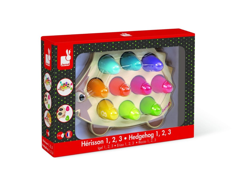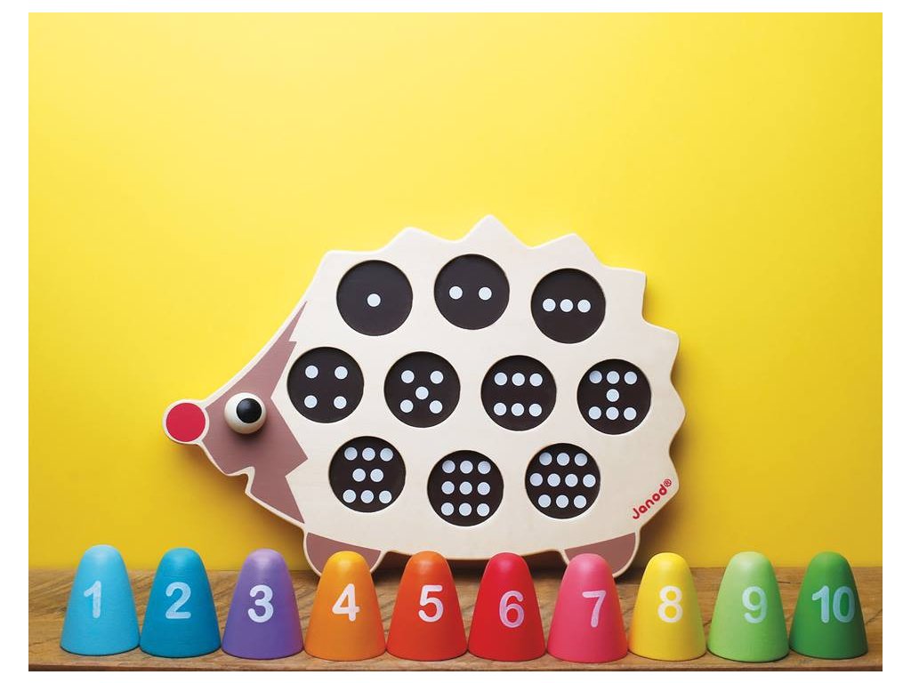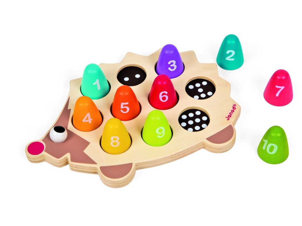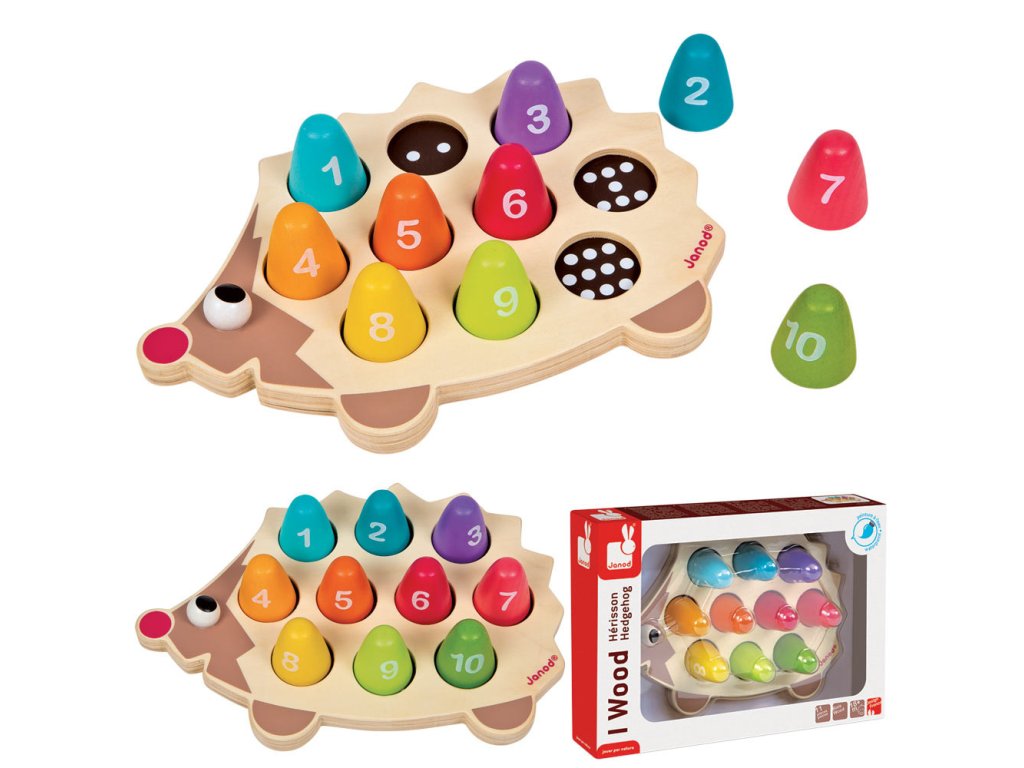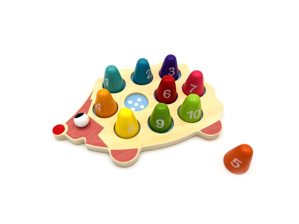 Ježek i všechny jeho části jsou vyrobeny z kvalitního dřeva, které je pevné a odolné. Barvy použitých netoxických laků jsou zcela bezpečné pro děti, což zaručuje klid pro rodiče. Každý dílek je označen číslem a na ježkovi jsou otvory se správným počtem puntíků, které dětem usnadňují správně přiřadit tvary. Díky tomu baví hra a zároveň učí základní číslice do 10 i rozpoznávání barev.