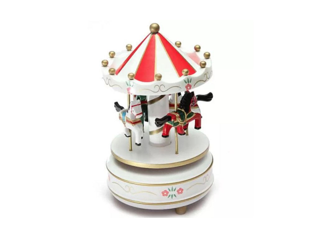 Objevte kouzlo klasického kolotoče s originálním hracím strojkem, který se aktivuje jednoduchým natažením pérka. Natahování je příjemně jemné, takže i malé ručičky si s úkolem snadno poradí. Jakmile se stroj rozběhne, zní z něj jemná melodie a kolotoč pomalu a ladně rotuje, přičemž koníčci na tyčkách se otáčejí kolem své osy, což dodává hře interaktivní kouzlo.